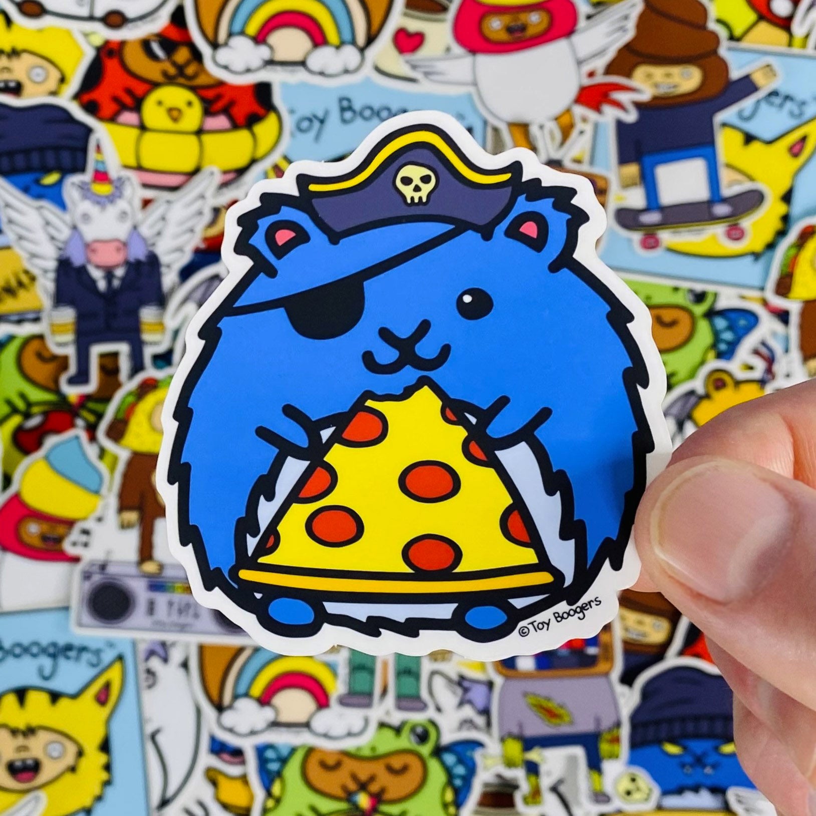 • Cute sticker of a hamster in a pirate hat holding a slice of pizza.