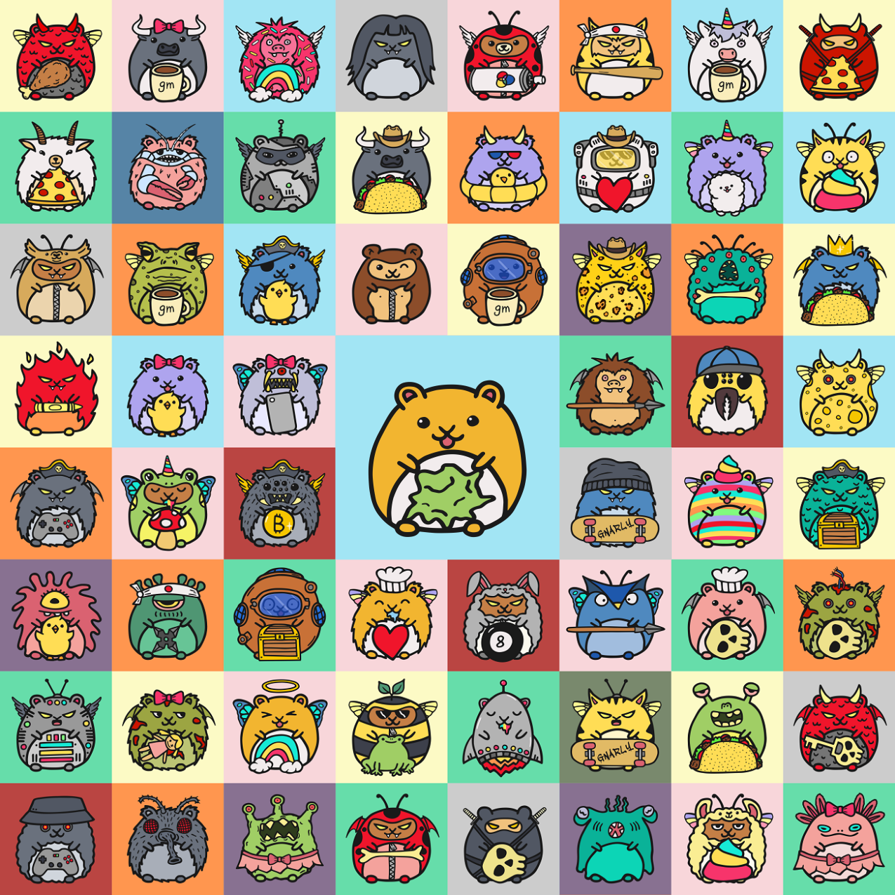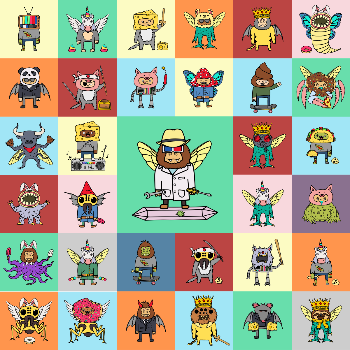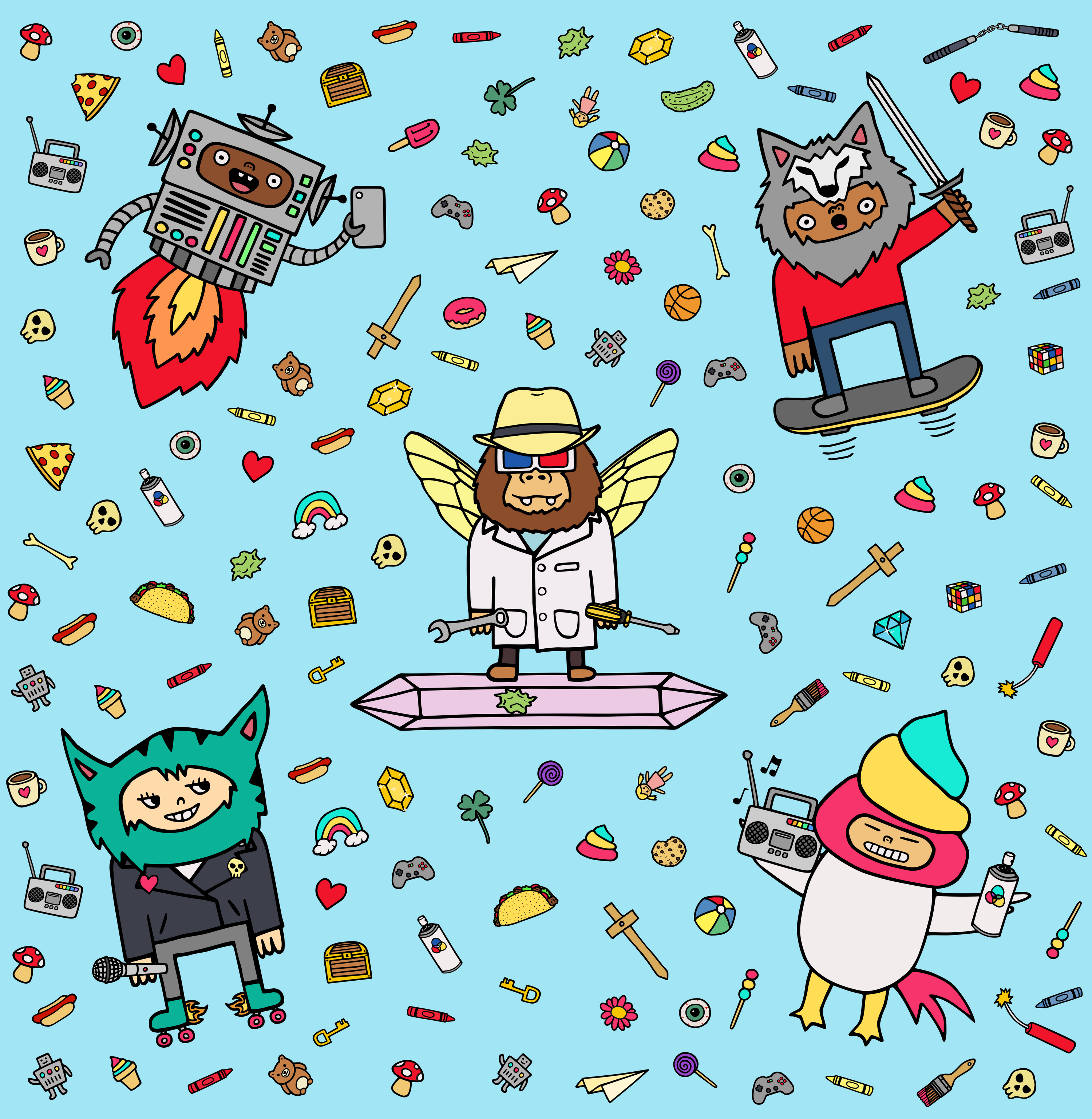The year was 2021 when a mad scientist named Dr. Douglas got obsessed with digital collectibles and started to build a teleportation machine that would allow him to teleport into the metaverse. His plan was to go there with all his friends so that they could live in cyberspace and collect as many digital toys as they wanted. Shortly after starting on the construction of this teleportation machine, a cute but mysterious hamster somehow found its way into his secret laboratory. Dr. Douglas decided to adopt the cute little hamster and named him Stash because the hamster liked to find items from around the lab and stash them in hiding places. This should have concerned Dr. Douglas, but Stash was too cute, and this lowered his guard just enough. Hastily, the construction of the teleportation machine was completed. His plan was to gather a group of his friends, who were also obsessed with toys and collectibles, and teleport as a group into cyberspace for good. They would leave the real world behind and dwell in their own digital paradise forever. The big day finally came and they activated the machine and went through its teleporting vortex. But little did they know, somehow a booger got stuck on the teleportation machine's focusing crystal and caused a critical but delightful malfunction. When they used the machine, they got multiplied, combined, and rearranged with all the crazy characters and toys in their collections as they teleported into the metaverse. They entered the scene as a wacky bunch of mismatched creatures and became known as the Toy Boogers!